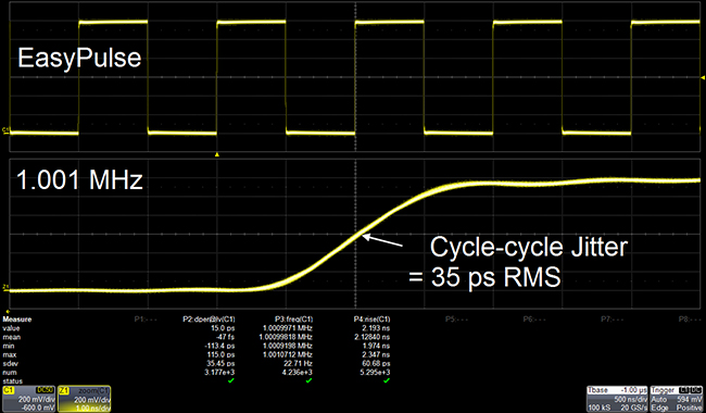 创新的EasyPulse 技术 DDS 方法输出方波/脉冲时, 如果采样率和输出频率不成整数倍关系,将产生一个采样周期的抖动。采用 EasyPulse 技术可克服这个缺陷;产生低抖动的方波和脉冲信号,此外还具有以下优势: